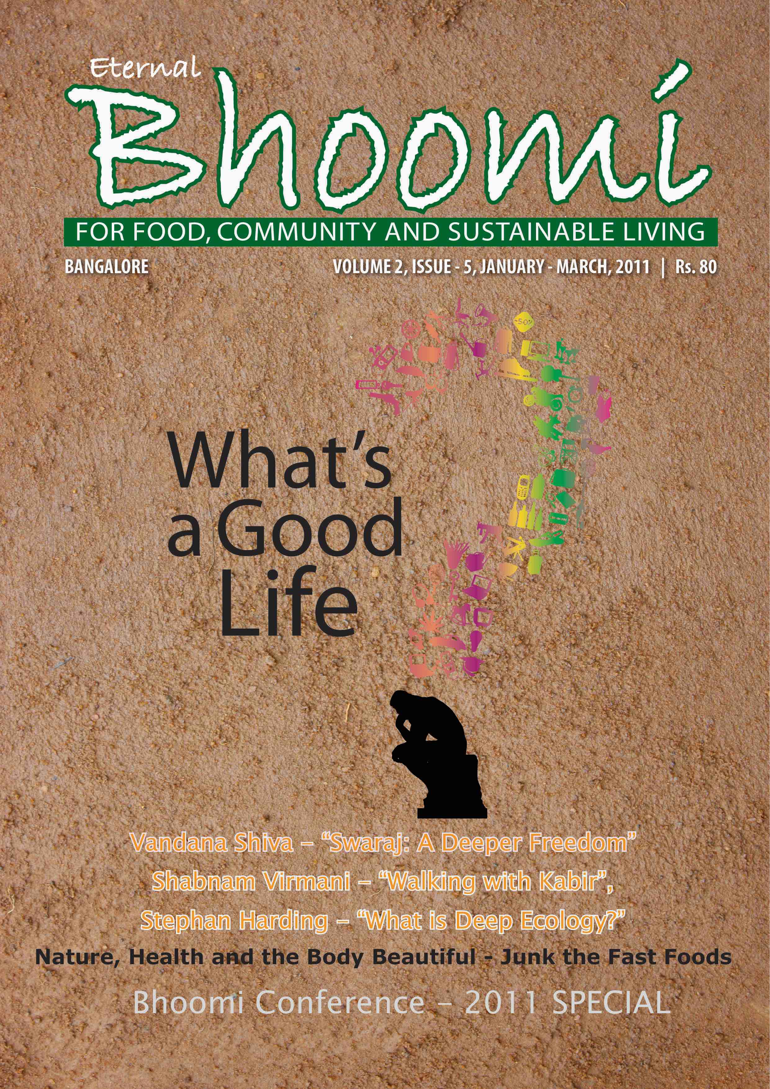 We have completed one year of Eternal Bhoomi – it has helped to bring together several people from many walks of life to participate in our forthcoming Bhoomi Conference -2011 on ‘What’s a Good Life?’ This would not have been possible if it were not for the generosity of many with gifts in the form of articles, illustrations, innumerable photographs, designs and ideas from readers and well-wishers.